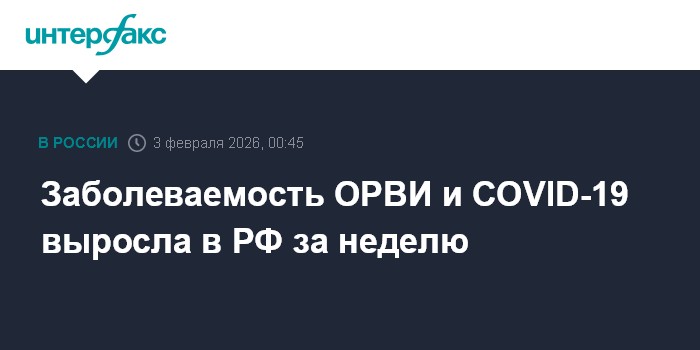Москва. 3 февраля. INTERFAX.RU - Заболеваемость ОРВИ в РФ по сравнению с прошлой неделей выросла на 9,6%, заболеваемость COVID-19 за аналогичный период выросла почти на 6%, сообщили в Роспотребнадзоре.