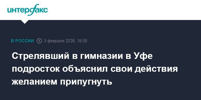 Москва. 3 февраля. INTERFAX.RU - Подросток, устроивший стрельбу из пластикового пневматического автомата в уфимской гимназии № 16 во вторник, заявил, что хотел просто припугнуть.
