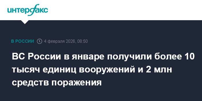Москва. 4 февраля. INTERFAX.RU - В январе 2026 года российская армия получила более 10 тысяч единиц вооружений и около 2 млн средств поражения, заявил министр обороны Андрей Белоусов на совещании по вопросам производства и поставки особо востребованных образцов вооружения, военной и специальной техники. Об этом сообщила пресс-служба Минобороны.