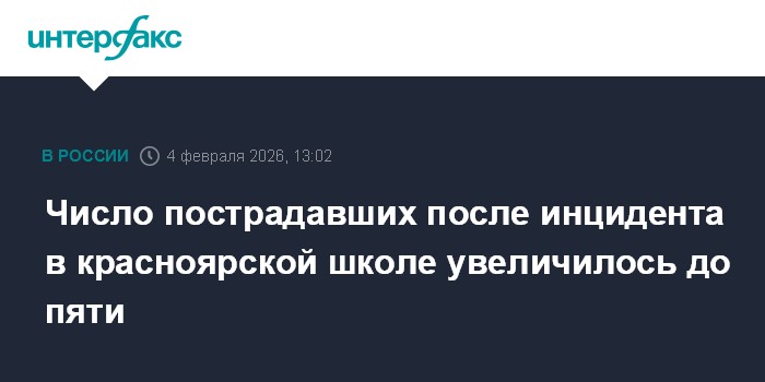 Москва. 4 февраля. INTERFAX.RU - Число госпитализированных после инцидента в школе микрорайона Покровка в Красноярске, по предварительным данным, возросло до пяти, сообщили "Интерфаксу" в пресс-службе регионального Минздрава.