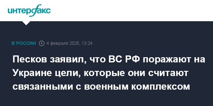 Москва. 4 февраля. INTERFAX.RU - Вооруженные силы РФ наносят на Украине удары по объектам, связанным с военным комплексом, заявил пресс-секретарь президента РФ Дмитрий Песков.