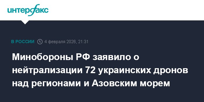 Москва. 4 февраля. INTERFAX.RU - Средства противовоздушной обороны с 14:00 до 20:00 перехватили и уничтожили 72 украинских беспилотника самолетного типа, сообщили в министерстве обороны РФ в среду.