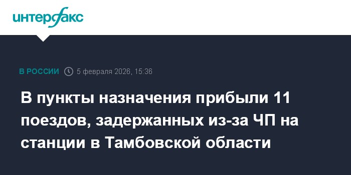 Москва. 5 февраля. INTERFAX.RU - В пункты назначения прибыли 11 пассажирских поездов, задержанных из-за происшествия на станции "Кочетовка-2" в Тамбовской области, сообщила Федеральная пассажирская компания (ФПК).