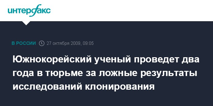 Москва. 27 октября. INTERFAX.RU - Южнокорейский ученый Хван У Сук приговорен к двухлетнему тюремному заключению с отсрочкой на три года за ложные результаты исследования в области клонирования, передает в понедельник британская телерадиокорпорация ВВС.