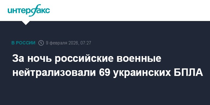 Москва. 9 февраля. INTERFAX.RU - В течение прошедшей ночи дежурными средствами ПВО перехвачены и уничтожены 69 украинских беспилотных летательных аппаратов самолетного типа, сообщили в министерстве обороны.