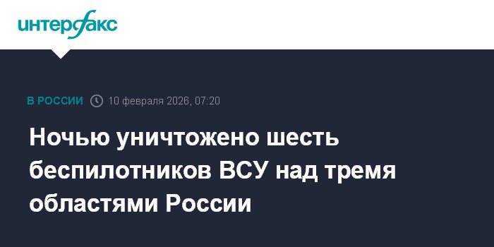 Москва. 10 февраля. INTERFAX.RU - Дежурными средствами ПВО с 23:00 до 07:00 по Москве вторника ликвидированы шесть украинских беспилотников самолетного типа, сообщили в Минобороны.