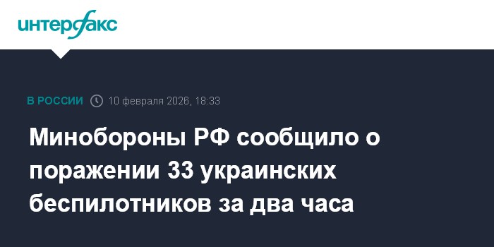 Москва. 10 февраля. INTERFAX.RU - Российские военные сообщили, что с 16:00 до 18:00 дежурными средствами ПВО перехвачены и уничтожены 33 украинских беспилотных летательных аппарата самолетного типа.