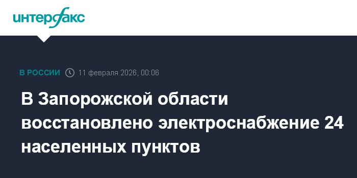 Москва. 11 февраля. INTERFAX.RU - Губернатор Запорожской области Евгений Балицкий сообщил о восстановлении электроснабжения в 24 населенных пунктах.