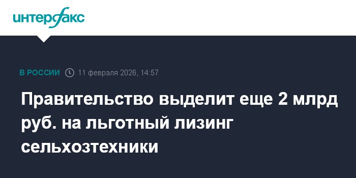 Москва. 11 февраля. INTERFAX.RU - Правительство РФ в преддверии весенне-полевых работ приняло решение о выделении дополнительно 2 млрд рублей на поддержку лизинга сельхозтехники.