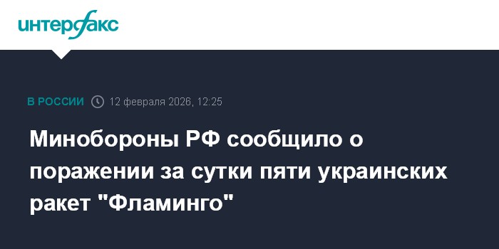Москва. 12 февраля. INTERFAX.RU - Российские военные сообщили, что в течение суток нейтрализовали 230 различных воздушных целей, в том числе пять украинских крылатых ракет "Фламинго".