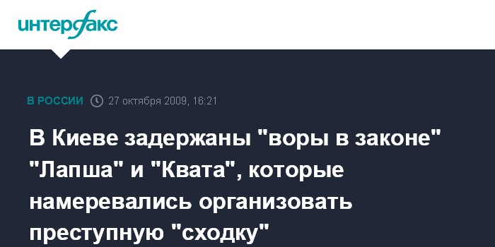 Москва. 27 октября. INTERFAX.RU - В Киеве милиция задержала двух "воров в законе", уроженцев Грузии, которые намеревались организовать "сходку" для перераспределения сфер влияния в странах бывшего СССР. Как сообщили в пресс-службе ГУБОП МВД Украины во вторник, "воры в законе", известные в преступном мире как "Лапша" и "Квата", хотели организовать сходку", которая, по информации оперативников, могла привести к возникновению конфликтных ситуаций между участниками группировок и повлечь за собой преступления с использованием оружия и взрывчатки.