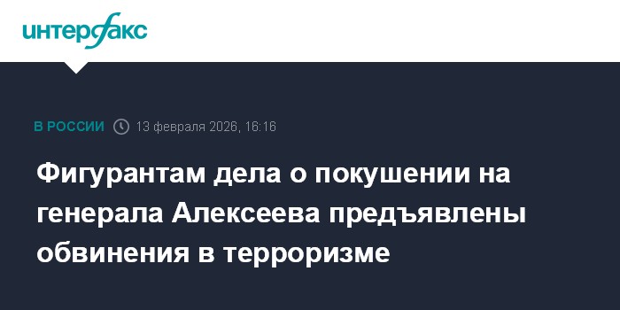 Москва. 13 февраля. INTERFAX.RU - Следствие по делу о покушении на убийство генерала Минобороны РФ Владимира Алексеева переквалифицировало обвинение фигурантам на "терроризм", сообщила официальный представитель Следственного комитета России (СКР) Светлана Петренко.