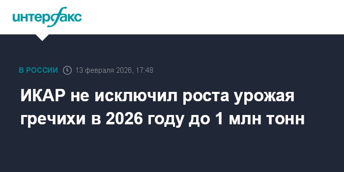 Москва. 13 февраля. INTERFAX.RU - Сбор гречихи в России в 2026 году может увеличиться до 1 млн тонн с 0,9 млн тонн в 2025 году, сказано в презентации Института конъюнктуры аграрного рынка (ИКАР), представленной на конференции "Где маржа-2026".