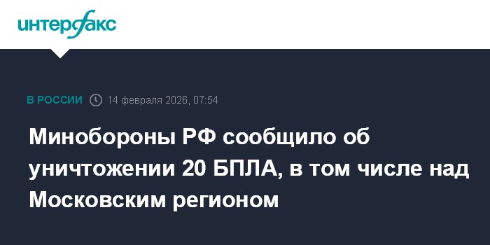 Москва. 14 февраля. INTERFAX.RU - Минобороны РФ заявило, что в течение ночи были уничтожены 20 украинских беспилотников, один из них - над Московским регионом.