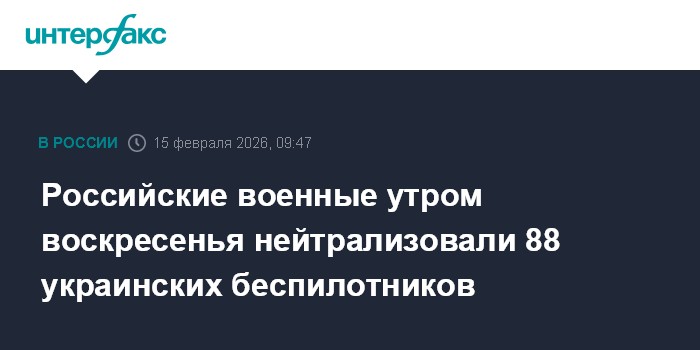 Москва. 15 февраля. INTERFAX.RU - Российские военнослужащие в период с 07:00 до 09:00 мск перехватили и уничтожили 88 украинских дронов над Астраханской, Брянской, Волгоградской областями, Азовским и Черным морями, а также над Республикой Адыгея, Краснодарским и Ставропольским краями, заявили в Минобороны России в воскресенье.