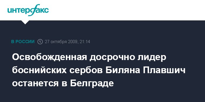 Белград. 27 октября. INTERFAX.RU - Бывший лидер боснийских сербов Биляна Плавшич, освобожденная из шведской тюрьмы, где она отбывала тюремное заключение по приговору Международного трибунала по бывшей Югославии (МТБЮ), останется в Белграде.