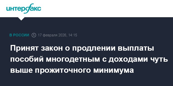 Москва. 17 февраля. INTERFAX.RU - Госдума на заседании во вторник приняла во втором и в третьем, окончательном, чтении закон, предусматривающий выплату пособия для малообеспеченных семей с детьми в случаях, когда среднедушевой доход не более чем на 10% превышает величину прожиточного минимума.