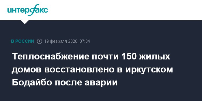 Москва. 19 февраля. INTERFAX.RU - Еще 26 жилых домов подключено к теплоснабжению в Бодайбо Иркутской области, где устраняют последствия коммунальной аварии, сообщил губернатор Игорь Кобзев в своем телеграм-канале в четверг.