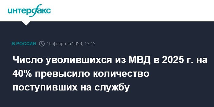 Москва. 19 февраля. INTERFAX.RU - Из органов внутренних дел РФ в 2025 году уволились 80 тыс. полицейских, что на 40% выше количества поступивших на службу, заявил министр внутренних дел Владимир Колокольцев.