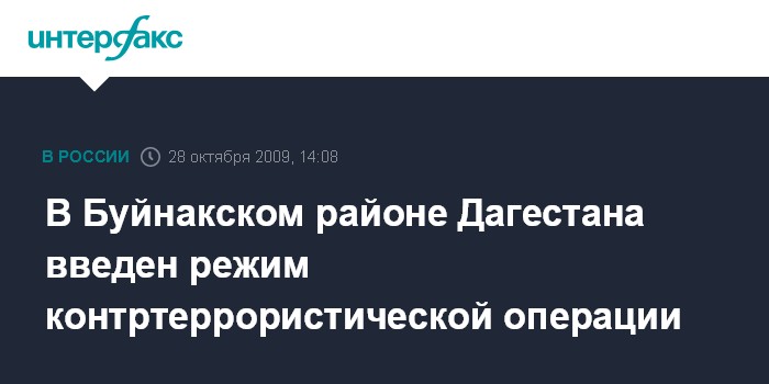 Москва. 28 октября. INTERFAX.RU - Режим контртеррористической операции введен в среду в 13:30 на территории Буйнакского района Дагестана, сообщили "Интерфаксу" в группе общественных связей (ГОС) УФСБ России по Дагестану.