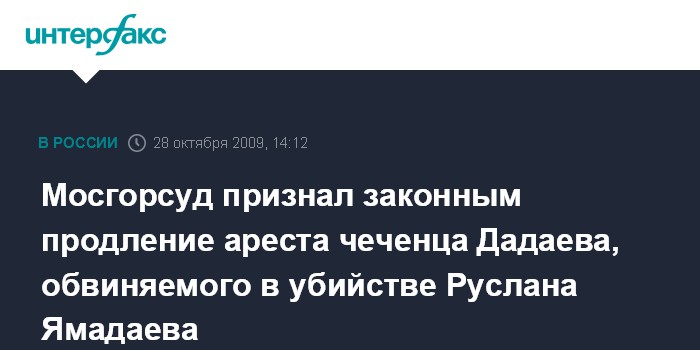 Москва. 28 октября. INTERFAX.RU - Мосгорсуд оставил под стражей до 24 декабря уроженца Чечни Асланбека Дадаева, обвиняемого в убийстве бывшего депутата Госдумы, Героя России Руслана Ямадаева.