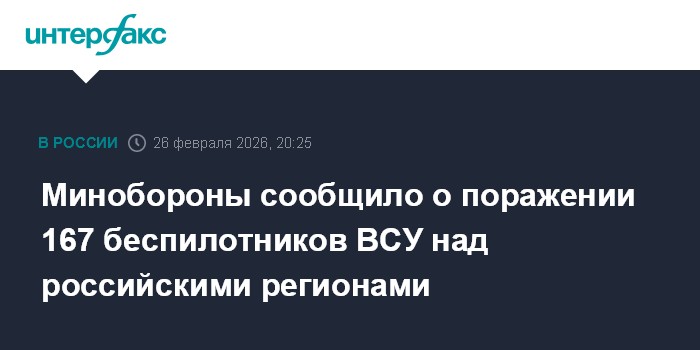 Москва. 26 февраля. INTERFAX.RU - Минобороны РФ сообщило, что с 14:00 до 20:00 по московскому времени дежурными средствами ПВО перехвачены и уничтожены 167 украинских беспилотных летательных аппаратов самолетного типа над территориями Брянской, Калужской, Курской, Орловской, Тульской областей, Республики Крым и Московского региона.