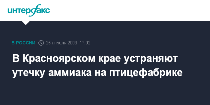 Красноярск. 25 апреля. INTERFAX.RU - На птицефабрике в 12 км от поселка Березовка Красноярского края в пятницу вечером произошла утечка аммиака, сообщила агентству "Интерфакс-Сибирь" сотрудник пресс-службы Сибирского регионального центра МЧС России Светлана Потехина.