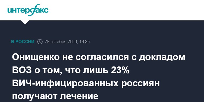Москва. 28 октября. ИНТЕРФАКС - Главный государственный санитарный врач РФ Геннадий Онищенко не согласен с оценками ВОЗ о том, что лишь четвертая часть ВИЧ-инфицированных россиян получает необходимое лечение.