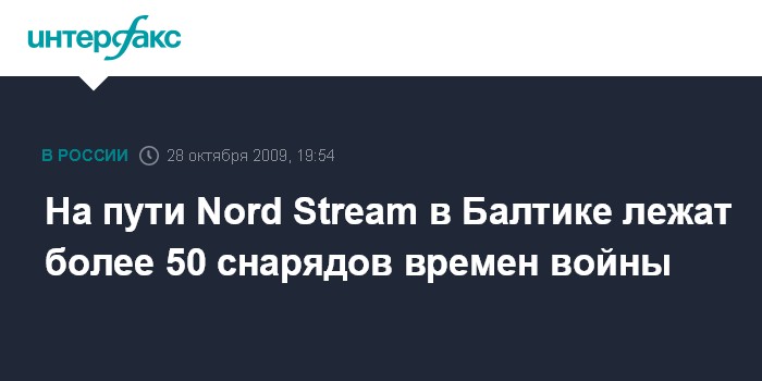 Брюссель. 28 октября. INTERFAX.RU - В ходе строительства газопровода "Северный поток" российско-германско-голландскому консорциуму придется убрать со дна Балтийского моря и ликвидировать около 50-ти неразорвавшихся снарядов, оставшихся со времен Второй мировой войны, сообщил глава представительства Nord Stream в Евросоюзе Себастьян Сасс.