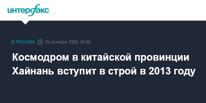 Пекин. 29 октября. ИНТЕРФАКС - Новый китайский космодром "Вэньчан" в южной островной провинции Хайнань вступит в строй в 2013 году, сообщил китайским журналистам один из руководителей строительства Ван Канцян.