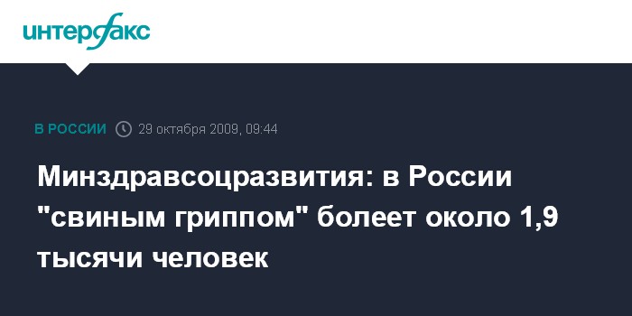 Москва. 29 октября. INTERFAX.RU - Число случаев заболевания свиным гриппом в России составляет 1896, сообщила заместитель главы Минздравсоцразвития РФ Вероника Скворцова.