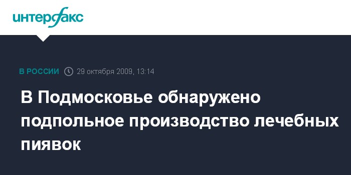 Москва. 29 октября. INTERFAX.RU - В Подмосковье сотрудники милиции обнаружили подпольную лабораторию, в которой хранились и расфасовывались контрафактные пиявки, сообщил в четверг "Интерфаксу" источник в правоохранительных органах. "В лаборатории было обнаружено свыше 4 тыс. пиявок. Со слов задержанного в лаборатории мужчины, пиявки реализовывались через интернет, а также в медицинских учреждениях Москвы и области по 39 руб. за штуку", - рассказал собеседник агентства.