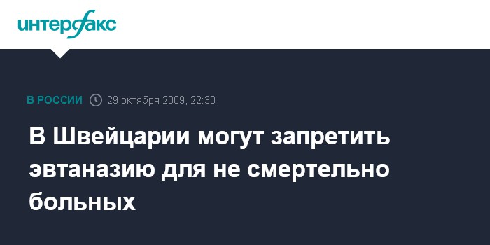 Вашингтон. 29 октября. ИНТЕРФАКС - Власти Швейцарии рассматривают законопроект, предусматривающий ограничения для круга лиц, которым разрешается добровольный уход из жизни в больницах страны, или даже полный запрет такой практики, сообщает в четверг американская телекомпания Си-Эн-Эн.