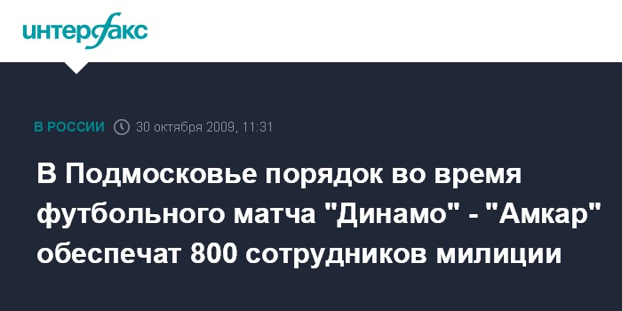 Москва. 30 октября. INTERFAX.RU - Охрану общественного порядка во время матча чемпионата России по футболу между командами "Динамо" (Москва) и "Амкар" (Пермь), который состоится в субботу в подмосковных Химках, будут обеспечивать более 800 сотрудников милиции.