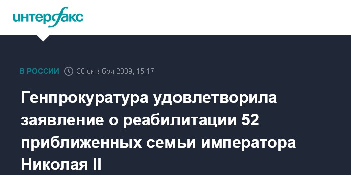 Москва. 30 октября. INTERFAX.RU - Генеральная прокуратура удовлетворила заявление Дома Романовых о реабилитации слуг, которых вместе с членами императорской фамилии репрессировали большевики после революции. "Сегодня, 30 октября, в День памяти жертв политических репрессий, из Генеральной прокуратуры получен ответ, в котором главе Дома Романовых Великой княгине Марии Владимировне сообщается, что ее обращение о реабилитации 52 лиц, приближенных императорской семье, рассмотрено и удовлетворено", - сказал "Интерфаксу" в пятницу адвокат Дома Романовых Герман Лукьянов.
