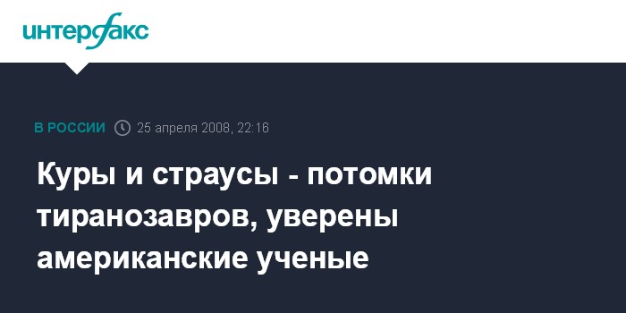 Нью-Йорк. 25 апреля. ИНТЕРФАКС - Американские ученые утверждают, что доказали, что современные птицы являются наиболее близкими потомками знаменитых плотоядных динозавров - тиранозавров, говорится в статье, опубликованной в пятницу в американском журнале "Сайенс".