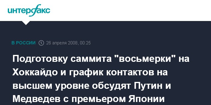 В свою очередь в Кремле "Интерфаксу" сообщили, что "в ходе визита Я.Фукуды планируется обсудить дальнейший график политического диалога на высшем уровне, включая подготовку отдельной встречи президента РФ и премьер-министра Японии "на полях" саммита "восьмерки" на Хоккайдо 7-9 июля".