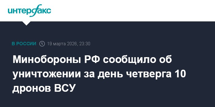 Москва. 19 марта. INTERFAX.RU - Российские военные с 8:00 до 20:00 мск четверга уничтожили десять украинских беспилотников, сообщило Минобороны РФ.