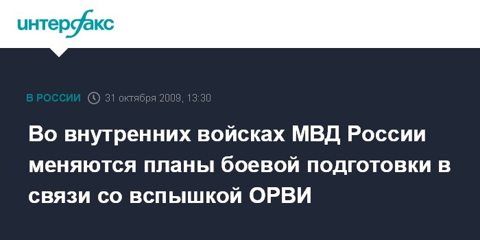Москва. 31 октября. INTERFAX.RU - Командование внутренних войск МВД России внесло коррективы в планы боевой подготовки и прохождения воинской службы частей внутренних войск в связи со вспышкой ОРВИ.
