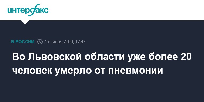 Львов. 1 ноября. INTERFAX.RU - Количество умерших от пневмонии во Львовской области Украины увеличилось до 22 человек, сообщили агентству "Интерфакс-Украина" в пресс-службе облгосадминистрации. Всего по состоянию на утро 1 ноября в области насчитывается 78 тыс. 102 больных ОРЗ и гриппом. Из них госпитализированы 1 тыс 799 человек. 33 человека находятся в реанимации, из них один ребенок. Кроме того, в отдельном боксе интенсивной терапии Львовской областной клинической больницы находятся 39 беременных женщин, больных пневмонией.