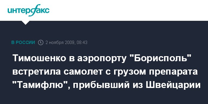 Москва. 1 ноября. INTERFAX.RU – В понедельник ночью в международный аэропорт "Борисполь" из Швейцарии прибыл самолет АН-В12 с грузом противовирусного препарата "Тамифлю". В аэропорту самолет с ценным грузом встретили Премьер-министр Юлия Тимошенко, Глава Секретариата Президента Вера Ульянченко и Министр иностранных дел Петр Порошенко, сообщает официальный сайт президента.