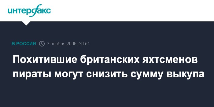 Лондон. 2 ноября. INTERFAX.RU - Сомалийские пираты могут освободить двоих британских яхтсменов за значительно меньшую сумму, чем 4,2 млн фунтов стерлингов, приводит британская телекомпания Sky News слова Эндрю Мвангуры, координатора Программы по поддержке моряков в Восточной Африке.