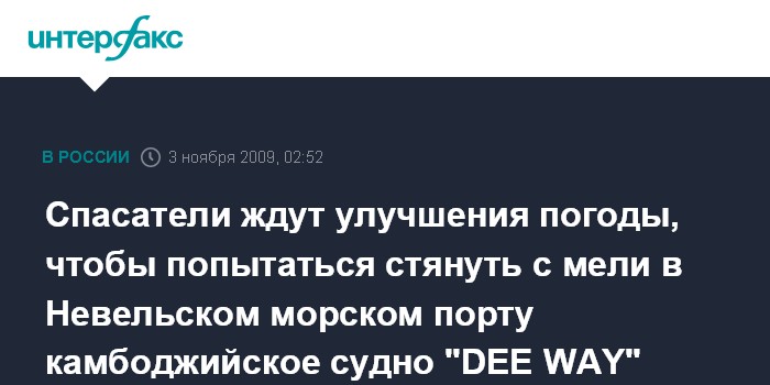 Спасатели ждут улучшения погоды, чтобы попытаться стянуть с мели в Невельском морском порту камбоджийское судно "DEE WAY"