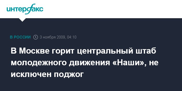 Москва. 3 ноября. ИНТЕРФАКС-МОСКВА - В Москве в Северном административном округе горит центральный штаб молодежного демократического антифашистского движения "Наши", расположенный на Первой улице Ямского поля 24-а.