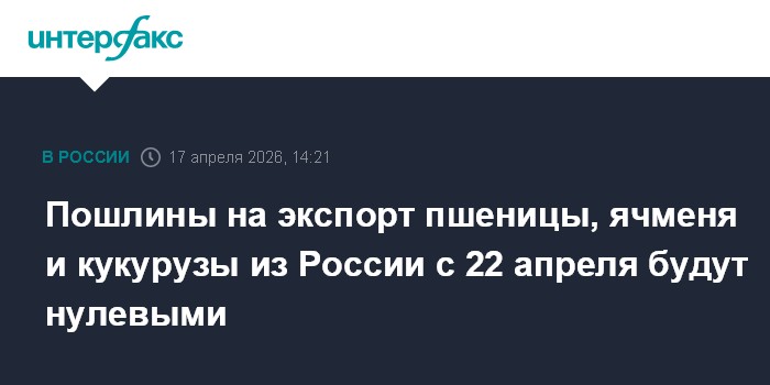 Москва. 17 апреля. INTERFAX.RU - Ставка пошлины на экспорт пшеницы из России с 22 апреля будет нулевой против 329 рублей за тонну неделей ранее, сообщает Минсельхоз. Таким образом, она вернулась к показателю середины марта.