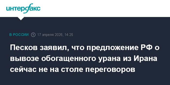 Москва. 17 апреля. INTERFAX.RU - Предложение России о вывозе обогащенного урана из Ирана сейчас не "на столе переговоров", но российская сторона к этому открыта, заявил пресс-секретарь президента РФ Дмитрий Песков.