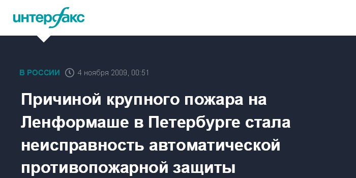 Санкт-Петербург. 4 ноября. ИНТЕРФАКС СЕВЕРО-ЗАПАД - Неисправная система противопожарной защиты и позднее обнаружение возгорания стали причинами быстрого распространения огня на территории ОАО "Ленформаш" в Санкт-Петербурге, установили в МЧС.