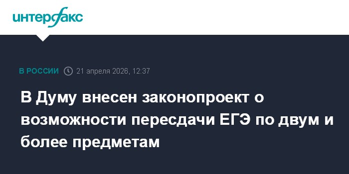 Москва. 21 апреля. INTERFAX.RU - Законопроект о возможности пересдачи ЕГЭ по двум и более предметам внесен в Госдуму, следует из базы данных ГД.