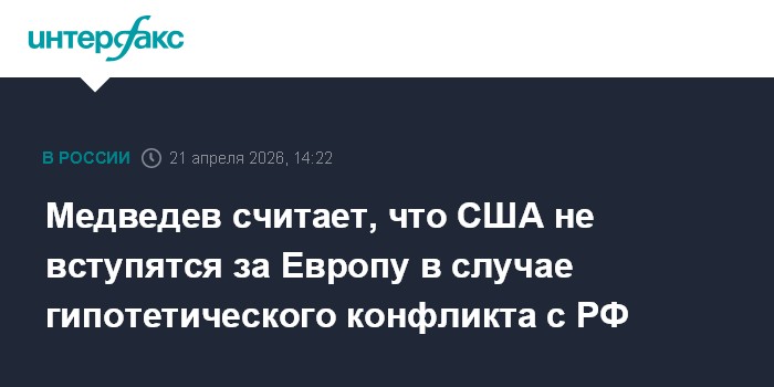Москва. 21 апреля. INTERFAX.RU - Европе не стоит рассчитывать на активное вмешательство США в гипотетический конфликт отдельных стран ЕС с Россией, считает заместитель председателя Совета Безопасности РФ Дмитрий Медведев.