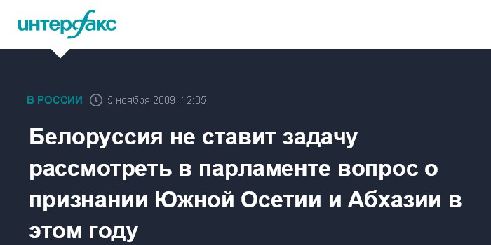 Москва. 5 ноября. INTERFAX.RU - Перед парламентом Белоруссии не стоит задача рассмотреть вопрос о возможном признании независимости Южной Осетии и Абхазии до конца текущего года, заявил журналистам в четверг в Минске председатель комиссии по международным делам и связям с СНГ Палаты представителей Национального собрания Белоруссии Сергей Маскевич.